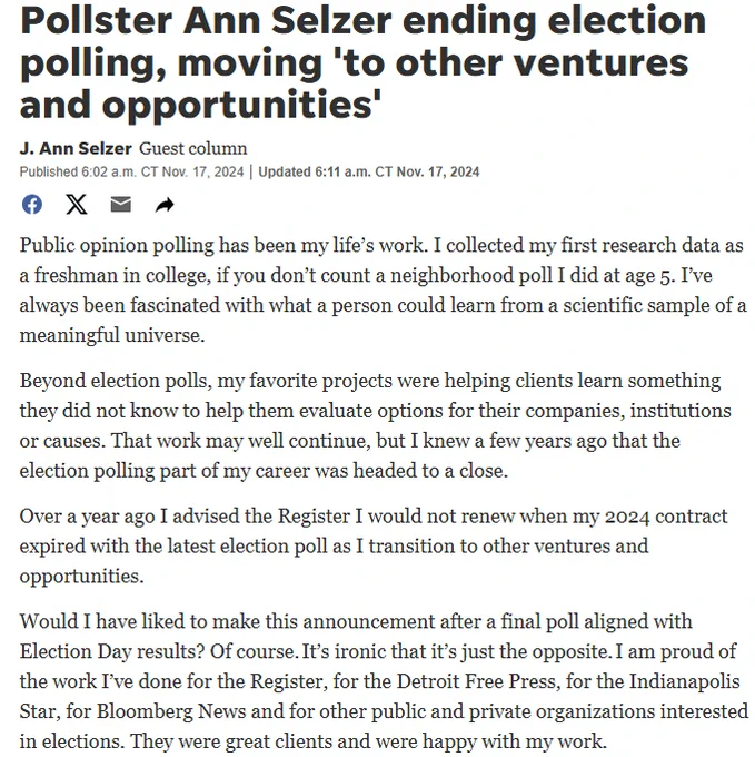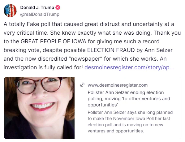 “A totally Fake poll that caused great distrust and uncertainty at a very critical time,” Trump wrote on his Truth Social website on Sunday. “She knew exactly what she was doing.”