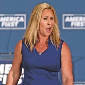 Nick Fuentes, left, and Marjorie Taylor Greene, right, in a composite image.Getty Images