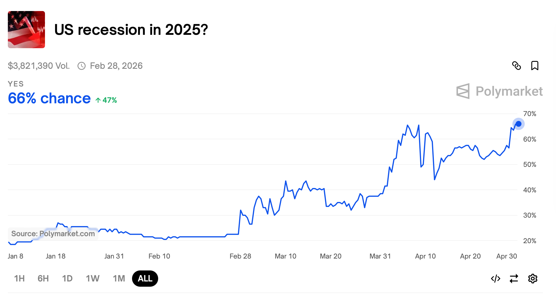 U.S. Recession Odds on Polymarket Plunge to 22% as Trade Tensions Cool